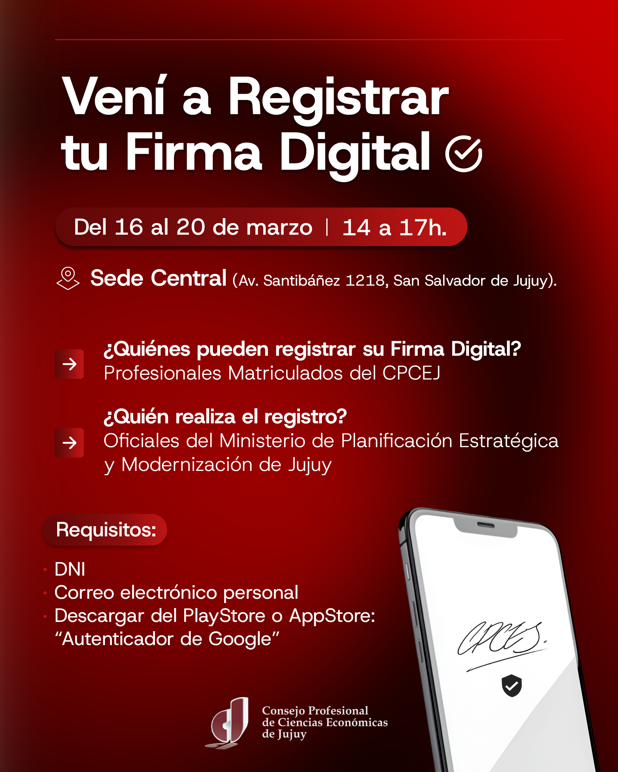 En la semana del 16 al 20 de marzo, en Sede Central del CPCEJ, el ministerio de Planificación Estratégica y Modernización de Jujuy, como autoridad de registro, estará registrando firmas para aquellos matriculados que aún no posean firma digital remota. Hay horarios y requisitos a tener en cuenta.