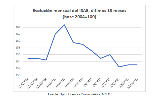 A octubre del 2025, la economía jujeña muestra una leve caída de la actividad económica, con una disminución del -0,9% con respecto a diciembre 2024 del Indicador Sintético de Actividad Económica (ISAE), acompañado de una variación mensual nula del 0%.