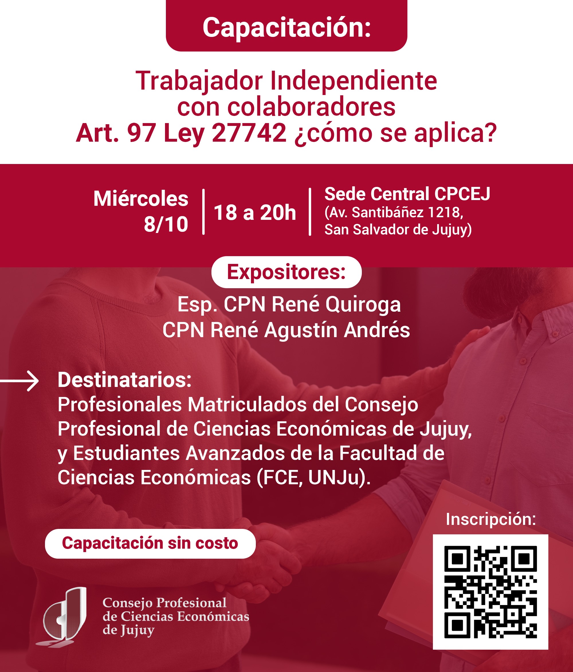 En la segunda semana de octubre, el Consejo Profesional de Ciencias Económicas de Jujuy (CPCEJ) propone dos capacitaciones presenciales, gratuitas y destinadas a profesionales matriculados del Consejo y estudiantes avanzados de la Facultad de Ciencias Económicas (FCE, UNJu), para participar hay que registrarse en los formularios online: